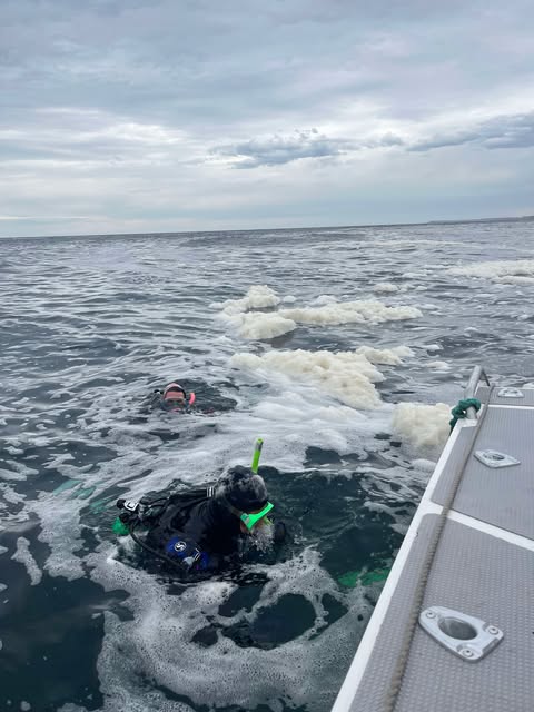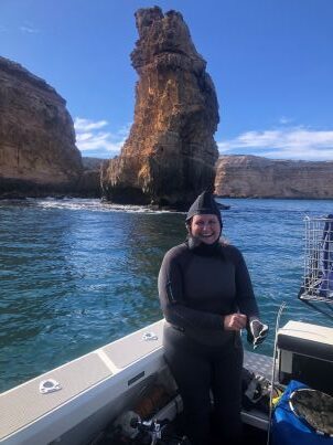 We headed along the coast to Cape Spencer thinking we could dive in the sheltered bay under the lighthouse, unfortunately it was too choppy in this area so it was decided to head out to Althorpe island thinking we could dive on the sheltered side of the island. The way that the waves and swell mix around the island made it difficult to find a calm area, finally we anchored in the calmest stop in approx. 200m from the island in about 12m. This was not going to be a pretty dive, as soon as we got to the bottom where was a back and forth swell and poor visibility, so it was going to be purely for Crustacean relocation. Almost immediately some red cray legs were seen in a rock crevice. Surprisingly there were 2 in there together, after they were relocated into a catch bag we slowly moved around the undulating bottom while constantly being moved back and forth with the swell, another cray was found and caught and it was time to head back to the boat. When we came up the surface was covered with a thick sea foam which totally cover us and at one stage I couldn’t see through it to the boat.